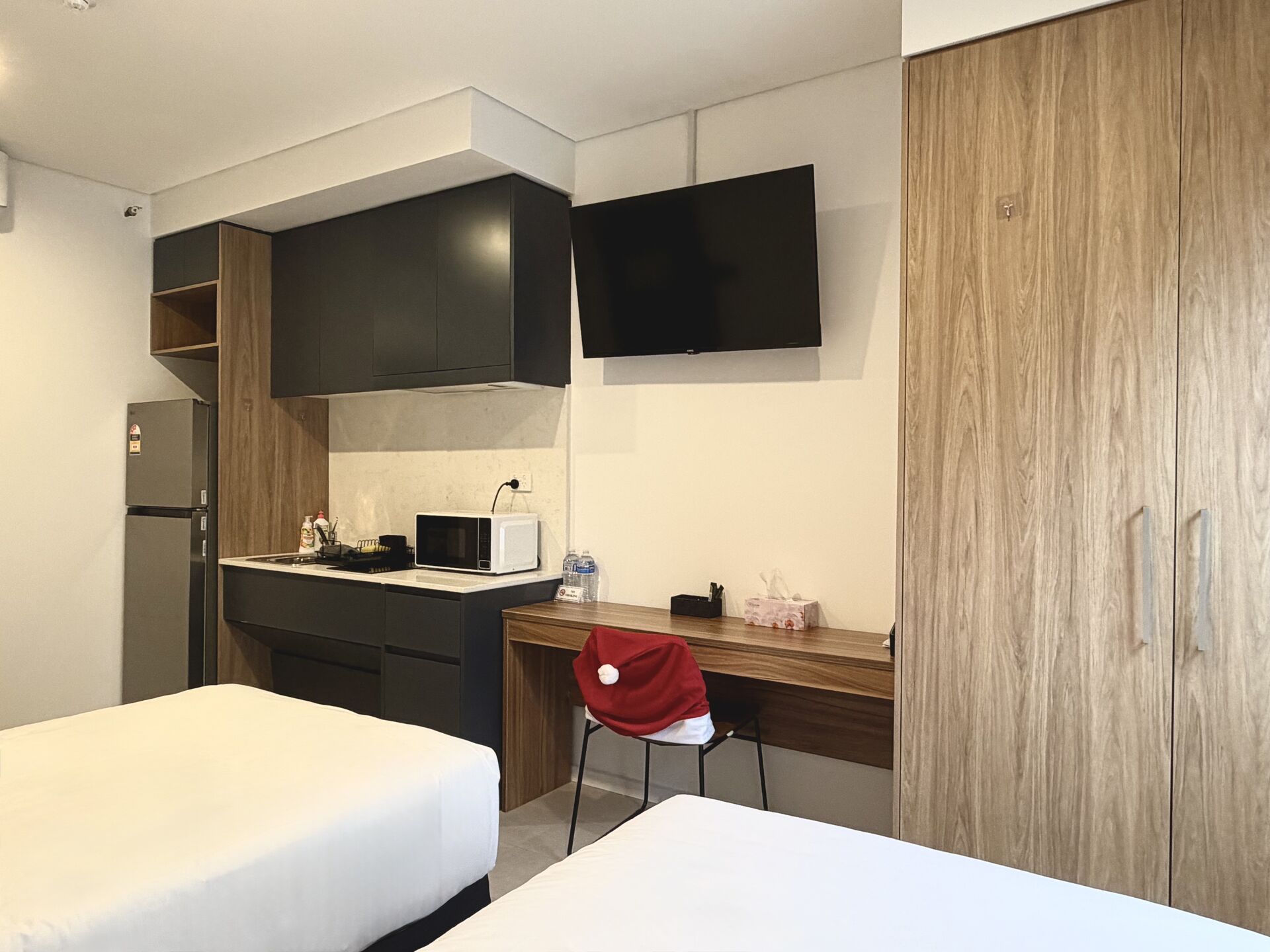 - Kitchenette with microwave, fridge, and basic utensils